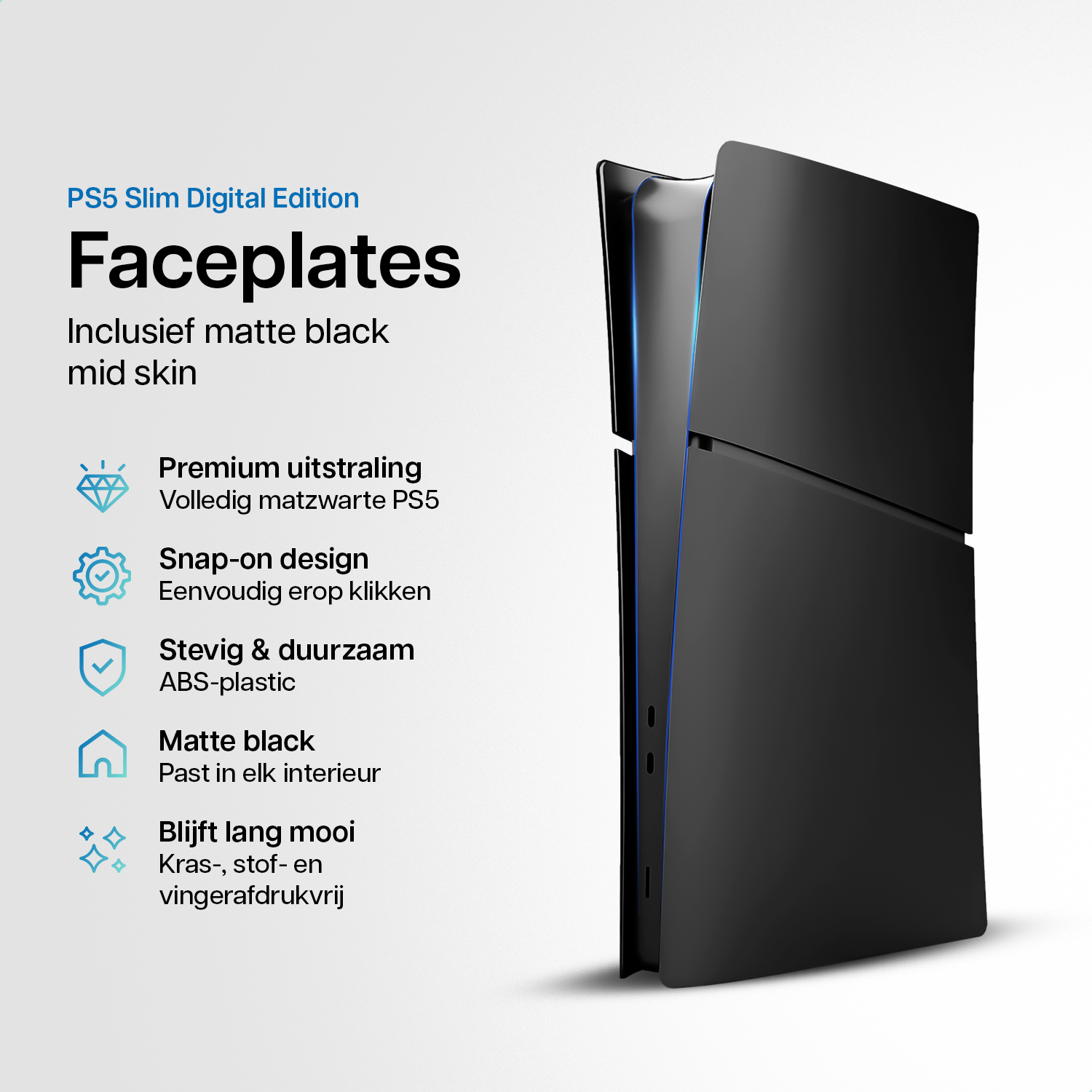 Past het witte design van de PlayStation 5 Slim niet bij je interieur? Of wil je gewoon de strakke matzwarte look? Met deze custom faceplates verander je jouw PS5 Slim in een stijlvolle blikvanger. De platen zijn kras-, stof- en vingerafdrukvrij en klikken eenvoudig op je console. Wil je de look echt compleet maken? Dan kun je optioneel de meegeleverde mid-skin gebruiken om ook het middelste gedeelte volledig matzwart te maken.