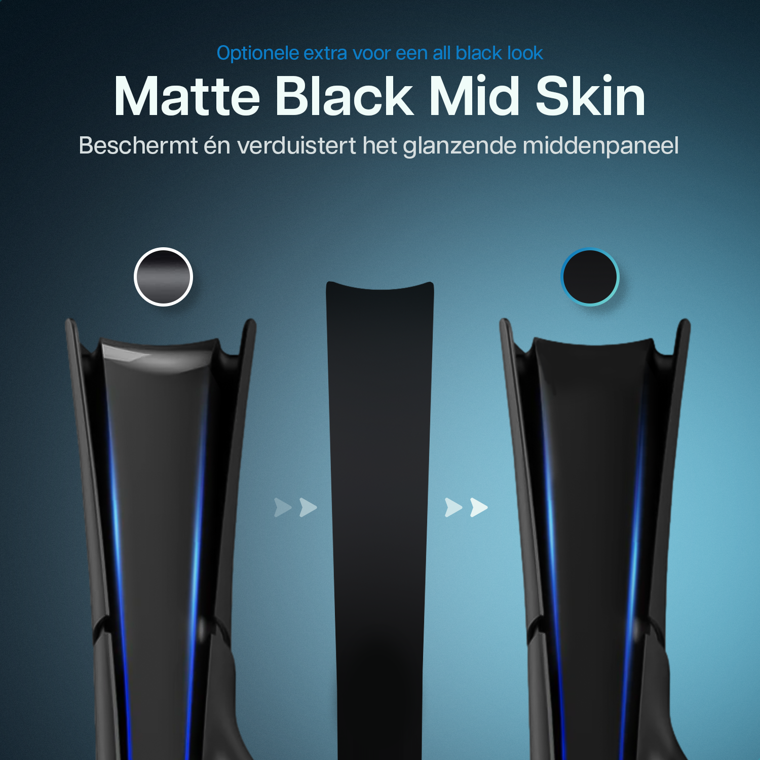 Zonder een mid-skin blijft het middelste gedeelte van je PlayStation 5 Slim glanzend zwart. Daarom hebben wij er één bijgevoegd om je console volledig matzwart te maken. Het aanbrengen is optioneel en vraagt iets meer tijd en geduld, maar geeft je wél de ultieme all-black look.